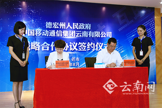 为贯彻云南省委九届十次全会决定,落实国家“互联网+”战略,以互联网创新技术促进德宏融入“一带一路”战略和“孟中印缅经济走廊”建设,用信息化传承德宏民族文化,8月24日,德宏州政府与中国移动通信集团云南有限公司(以下简称:中国移动云南公司)在芒市签署战略合作协议。德宏州人民政府副州长柳五三,中国移动云南公司副总经理冯毅、中国移动云南公司德宏分公司总经理尹以辉出席签约仪式。此外,州发改委、州工信委等19个单位的有关领导参加签约仪式,州政府副秘书长蔺程如主持。