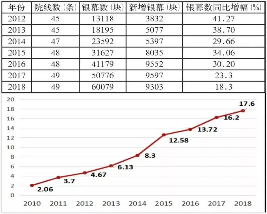 上图:2012-2018年中国电影影院建设数据情况;下图:2010-2018年度观影人次(单位:亿人)