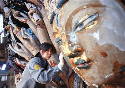 昨日,一名文物修复人员在仔细检查揭取金箔后露出的千手观音主尊像石质胎体部分的完好程度。千手观音是世界文化遗产重庆大足石刻的精华部分,造像有1007只手臂,状如孔雀开屏。此次千手观音造像修复从2008年启动,预计将在2015年完成。